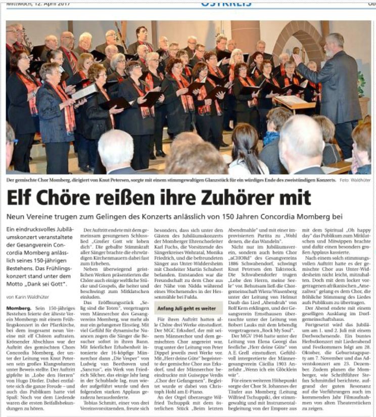 Unterstützen Sie, liebe Leserin oder lieber Leser, unseren Verein, indem Sie Mitglied werden und sich als Sängerin oder Sänger engagieren. Chorprobe des gemischten Chores ist jeden Montag, ab 20.00 Uhr im Dorfgemeinschaftshaus. Selbstverständlich sind uns Sponsoren von außerhalb des Vereins stets willkommen. Das war unsere Geschichte, angereichert mit kleinen Geschichtchen.