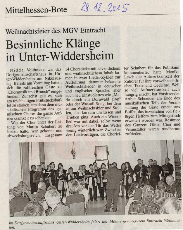 Zur Hauptversammlung hatte der Männergesangverein Eintracht Unter-Widdersheim ins Dorfgemeinschaftshaus eingeladen. Vorsitzender Arthur Schneider wies in seinem Bericht auf den Mitgliederbestand hin, der sich mit 102, darunter 32 Ehrenmitglieder, nahezu auf dem gleichen Stand der Vorjahre bewegt. Im gemischten Chor singen 24 Mitglieder, die sich in 43 Chorproben auf dreizehn öffentliche Auftritte vorbereitet hatten. So hat der Chor im vergangenen Jahr beim Frühlingsfest, bei den Liederabenden in Eichelsdorf und Gettenau, beim Dorffest, bei einem Gottesdienst und bei der Weihnachtsfeier des VdK-Ortsverbandes mitgewirkt. Außerdem wurde mit großem Erfolg die eigene „Musikalische Weltreise“ im Dorfgemeinschaftshaus veranstaltet.