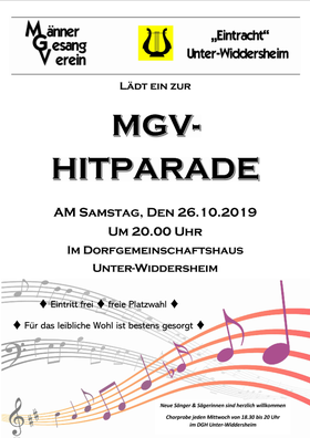 „20 Uhr, vier Minuten und 18 Sekunden, hier ist die erste Hitparade aus Unter-Widdersheim“, so begrüßte Alexander Walz als Vertreter des legendären Dieter Thomas Heck am 26.10.2019 die Gäste des MGV Eintracht Unter-Widdersheim in ihrem Dorfgemeinschaftshaus und führte mit viel Energie, Leidenschaft und Witz durch den Abend unter dem Motto „Hitparade“.