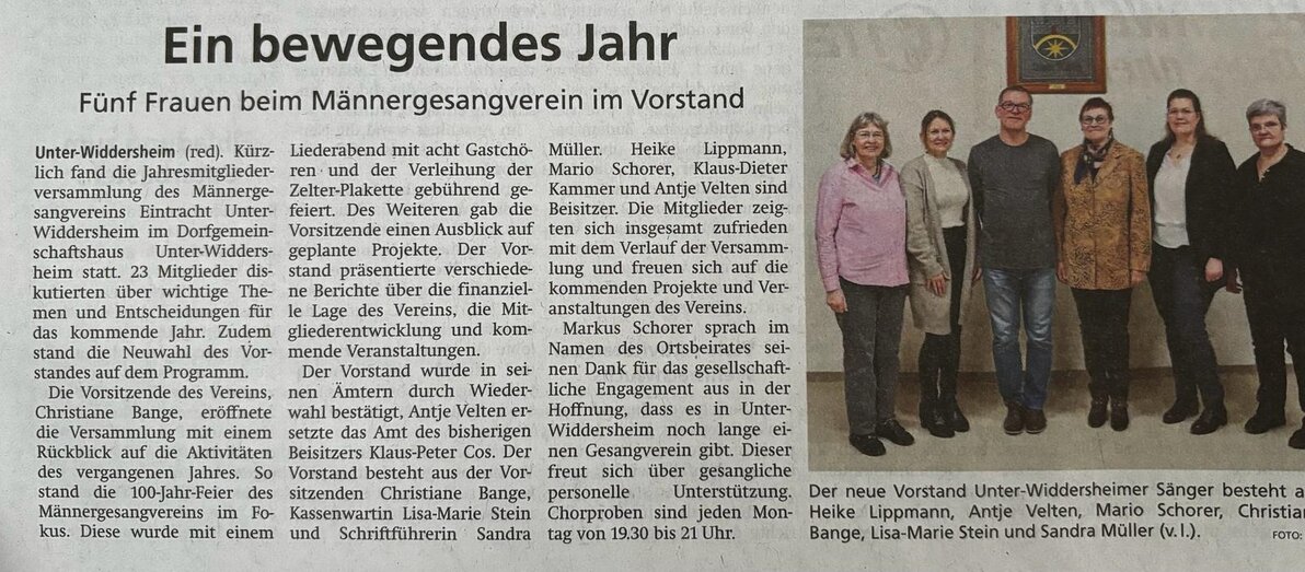 Der Männergesangverein "Eintracht" Unter-Widdersheim hatte seine Mitglieder für Samstag, 29.02.2020, 19:30 Uhr zur Jahresmitgliederversammlung ins Dorfgemeinschaftshaus Unter-Widdersheim eingeladen.