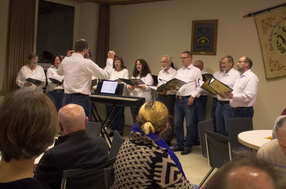 Der Abend stand unter dem Motto „Sing ein Lied“, damit begann der Chor unter Chorleiter Jan Frische aus Unter-Widdersheim sogleich. Nach weiteren Liedvorträgen des MGV Unter-Widdersheim übernahmen die Männer von Momberg, die mit Ihren Beiträgen ebenfalls die Zuhörer zu begeistern wussten. Die Männer wurden dann noch durch die Frauen unterstützt, und so gab der Gemischte Chor noch mal alles.